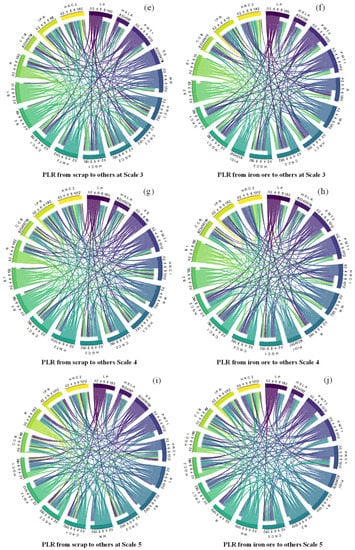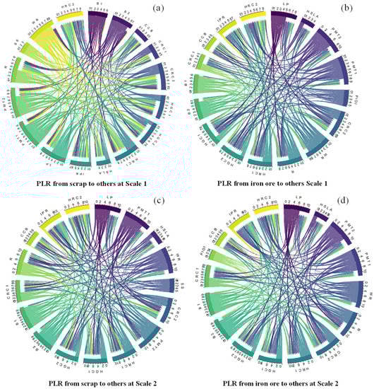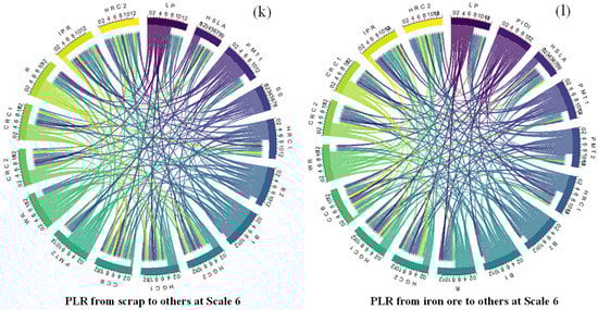 Figure 5 shows the PLRs from scrap steel and iron ore to other steel products at six time scales. Each color represents every steel product, and the flows with arrows between each entity represent the lead-lag relationship between steel products. The width of flow represents the number of lead-lag relationship coefficients between two steel products. Each arc is combined with two parts: those that lead relationships from one steel product to other products and those that lag relationships from other steel products to this entity.