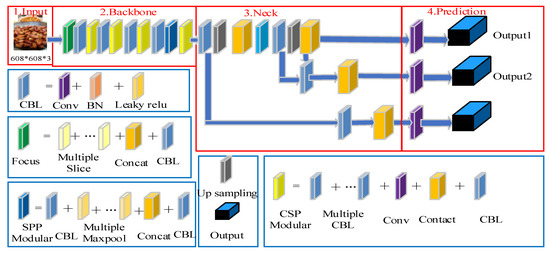 In Figure 1, the Input layer preprocesses the training dataset through the Mosaic data-enhancement method, adaptive anchor-frame calculation, adaptive picture scaling and other methods [38]; it initializes the model parameters and obtains the required picture size of the model. The Backbone layer divides the picture in the dataset through the Focus structure; then, it scales the length and width of the image continuously through the CSP structure. The Neck layer fuses the data set through FPN operation and PAN operation to obtain the prediction feature map of the dataset. The Precision layer calculates the gap between the prediction box and the real box through the calculation of the loss function; then, it updates the parameters of the iterative model through the back-propagation algorithm and filters the prediction box through the NMS operation weighted by the model post-processing operation to obtain the prediction results of the model.