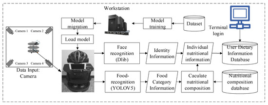 Figure 3 shows the workflow chart of the autonomous perception system for dietary nutritional information in a smart home environment. First of all, the Dell Tower 5810 workstation uses Algorithm 1 to train the food image dataset to obtain the food-recognition feature model w. Then, the obtained feature model w is transmitted to the social robot, which receives the model and loads it, and the multiple cameras deployed to the smart home environment and the social robot with depth cameras apply DNPM to start food-recognition detection while importing the face data feature database for face recognition. Finally, the food category information is mapped to the nutritional composition database according to the detected results, the nutritional composition is calculated (see Section 4), and the nutritional composition information of the user is obtained and stored in the user dietary information database. Users can query their dietary information through the terminal.