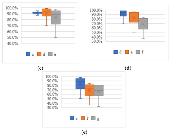 According to Figure 4, the median scale of Figure 4a–c is higher than 80.0%, indicating that the system showed good recognition performance for the data of the C1, C2 and C3 scenarios, while Figure 4d,e indicates that the lowest-value scale line is close to 30.0%, indicating that the system showed poor recognition performance for the data of the C4 and C5 scenarios. In general, the nutritional composition perception accuracy of the system was 90.1%, but in the case of complex personnel and food, the recognition and perception performance of the system was low; therefore, the recognition and perception robustness of the system needs to be further improved.