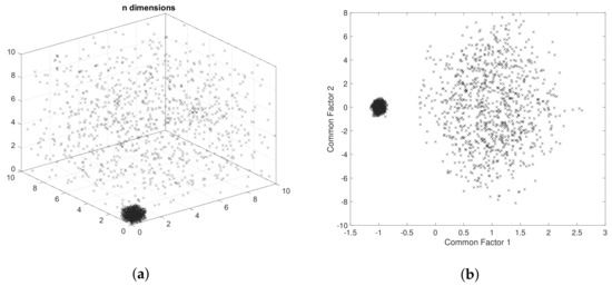 In short, as common factors, will preserve hidden relationships among variables, and the DBSCAN algorithm performs its clustering process in a two-dimensional space; a strategic approach is to preserve the first two common factors from the original dataset, which can be represented and plotted in a two-dimensional space. It is also expected that different magnitudes related to specific values inside the dataset remain preserved after the dimensionality reduction process, allowing DBSCAN to identify well-defined clusters. In other words, the original dataset of dimension of m variables and n sensors or dimensions can be represented in a lower dimension using the FA’s first two common factors as a dataset. Moreover, the new reduced dataset can now be graphically represented in a Cartesian coordinate system, in which every row from dataset represents an point in space. An example of the dimensionality reduction of a dataset of six-column vectors containing two classes is presented in Figure 1, in which the first three dimensions are plotted. After performing a dimensionality reduction using the first two common factors, the projection of these two classes is observable. Figure 1a presents a graphic representation of an artificial dataset with . Figure 1b illustrates the projection of the first two common factors of the artificial dataset with .