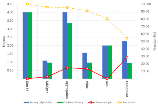 As previously mentioned, the clustering performance was measured using the external clustering evaluation metrics Entropy and precision and a comparative study using the Calinski–Harabasz clustering evaluation method. As shown in Figure 4, the clustering algorithm is capable of grouping well-condensed datasets with significant precision; nevertheless, the Entropy of the resulting clusters on these types of datasets is almost invariant. On the other hand, the information gain is relatively low in condensed datasets. Furthermore, it is evident that the automatic grouping process held by FA+GA-DBSCAN can perform clustering with similar characteristics as those presented by K-means, considering the Calinski–Harabasz clustering estimation technique. However, FA+GA-DBSCAN presents an advantage when evaluating datasets with an unknown number of classes, taking into consideration that the number of centroids or classes is not previously needed; this ensures a decent level of reliability of the results in an exploratory analysis performed by the presented methodology. The Entropy and precision of K-means are also reported in Figure 5.