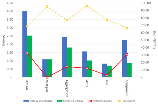 The Entropy indicates the degree of randomness in the data set when used as a metric to estimate the data set’s uncertainty. In this regard, when applying a recognition algorithm to a specific data set, it is expected that the classified data presents a reduction in its Entropy. The Entropy difference between unclassified and classified data represents the amount of information gained after applying a classification method. This difference or information gain, , also indicates the uncertainty reduction after splitting the data on a feature (i.e., the more significant the information gained, the greater the decrease in Entropy or uncertainty). The information gained is given as follows:
