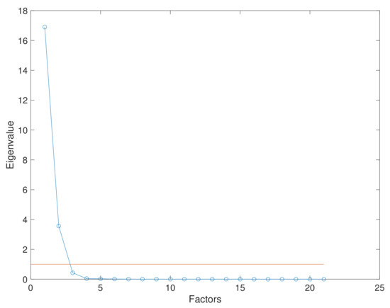 The performed analysis began with a dimensional reduction using FA. Then, the factor selection was analyzed by the “eigenvalues greater than one” method; this suggests that the first two common factors represent % of the variability of the original information. Finally, the scree-plot, as presented in Figure 6, represents the eigenvalue of each factor belonging to the considered dataset; it clarifies the FA and illustrates FA’s capacity to retain a large amount of information in a lower dimension.