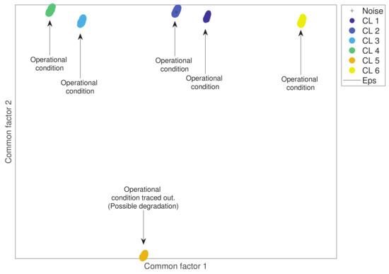 Furthermore, to perform this exploratory analysis, a matrix of was obtained. The two first common factors were considered as points in a two-dimensional space and then automatically grouped by the hybrid algorithm. Parameters and were defined, and the standard deviation of both parameters was measured after 30 equal runs. As a result, six well-condensed clusters were found. One of them is mainly traced out from the other five as presented in Figure 7. This may indicate a set of parameters related to engine degradation.