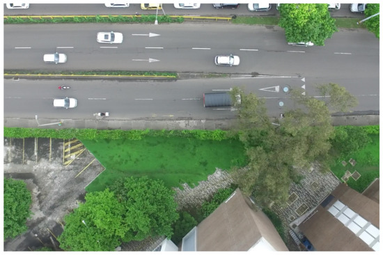 The Lidar dataset is a free access dataset available in Matlab R2021b [54] for clustering analysis. Lidar is a mapping system that employs laser energy for high-resolution spatial sensing. This laser technology has been widely used for digital cartography, military applications, cellphones, and autonomous mobility. In this study, the linear dataset presents a spatial overview of a street with a vehicle and various objects such as trees and buildings. This dataset can be assumed as a two-dimensional top base view from a surveillance unmanned aerial vehicle; a contextualization image is presented in Figure 8.