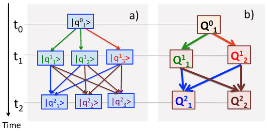 Three measurements, , are made on a three-level system, . The first one, yields an outcome and prepares the system in a state . Two other operators have degenerate eigenvalues, , (), and , (). (a) Nine virtual paths in Equation (3). (b) Four real paths (i.e., the observed sequences ), . Different colours are used to relate the virtual paths to the observed outcomes.