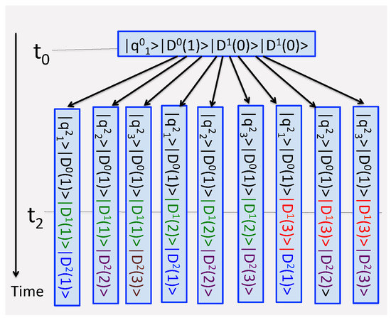 The measurements in Figure 1 seen from a different perspective. Just after , the experimenter needs to compare three records, in order to determine which of the real paths in Figure 1b was actually taken. This information is encoded in the final conditions of the three probes, , . The composite undergoes an unbroken unitary evolution for . There are nine virtual paths ending in distinguishable states of the composite. The same colors are used to indicate which of the nine path probabilities should be added to obtain likelihoods of the four real scenarios in Figure 1b.