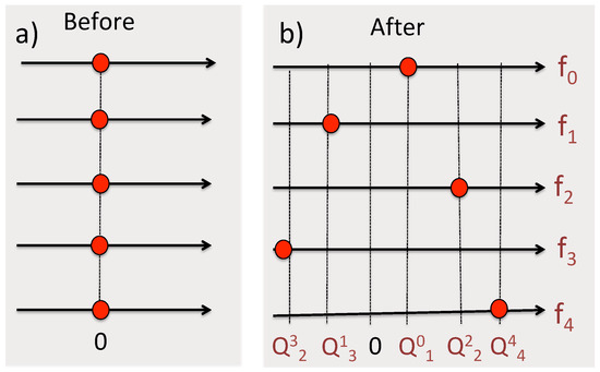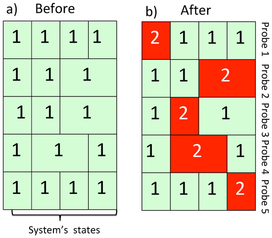 where, as before, we we assumed , , and . The experimenter prepares all probes in the states (14) and, once the experiment is finished, only needs to check which sub-system of , say, the -th, has changed its state. This will tell him/her that the value of at was . As a simple example, Figure 3 shows an outcome of five measurements made on a four-state system. There the first probe, capable of distinguishing between all four states prepares the system in a state . The second probe cannot tell apart the third and the second states, so , , and , and so on. The sequence of the measured valued obtained by inspecting the probes at is . After many trials the sequence will be observed with a probability [cf. Equation (5)]