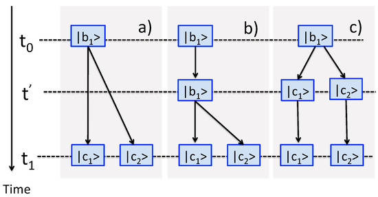 (a) In the case shown in Figure 5b, at one can add a measurement of , still leaving the probabilities unchanged, . It would appear that in a transition intermediate values and co-exist for any and , such that . (b) The above is no longer true if is measured before . The transition between the cases (a,b) is discussed in Section 7.