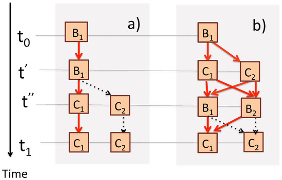 The former is no longer true if is measured before . A final value can now be reached via four real paths shown in Figure 6b, and the probabilities no longer agree with those Equation (32),
