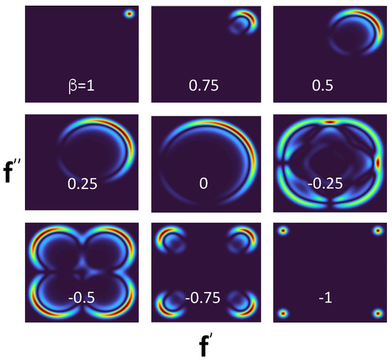 the integral in Equation (47) will diverge at large ’s provided the oscillations of and are cancelled by those of and , i.e., for . As a result, we find the pointer readings of two simultaneous accurate measurements of and (with ) distributed along the perimeter of a unit circle as shown in Figure 8. Figure 9 shows the distribution of the pointer’s readings for different degrees of overlap between the two measurements.