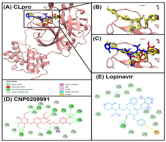Superimposed image of the active site cavity of 3CLpro (PDB ID: 6LU7) after docking. (A) All the docked ligands (native ligand: Grey color; Redocked ligand: Yellow color; Oleuropein (CNP0209991): Red color; Lopinavir: Blue color) in the catalytic active site. (B) Superimposed magnified image of native ligand and redocked native ligand. (C) Magnified image of all the docked ligands. (D) Molecular interaction analysis of oleuropein with 3CLpro amino acid residues. (E) Molecular interaction analysis of lopinavir with 3CLpro amino acid residues.