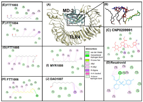 Superimposed image of docked ligands in the active site of TLR4 (PDB ID: 3FXI). (A) All the docked ligands (Native ligand: Grey color; Redocked ligand: Yellow and Green color; Oleuropein (CNP0209991): Red color; Resatorvid: Blue color) in the catalytic active site. (B) Magnified image of all the docked ligands. (C) Molecular interaction analysis of oleuropein (CNP0209991) with amino acid residues. (D) Molecular interaction analysis of resatorvid with amino acid residues. (E–J) Molecular interaction analysis of six lipid chains of lipopolysaccharides with amino acid residues.