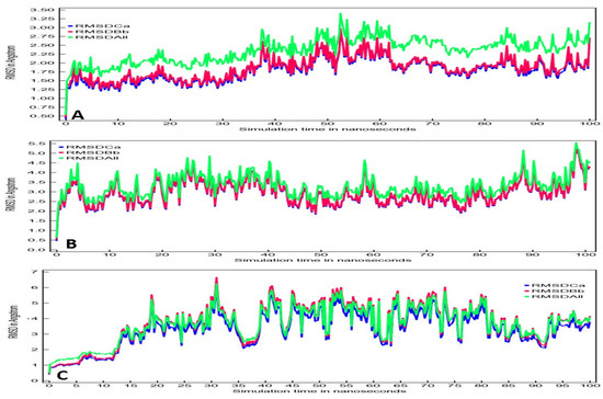 Root mean square deviations (RMSD) for Oleuropein-3CLpro, Oleuropein-TLR4, and Oleuropein-POP complex were shown in Figure 5. It contains backbone RMSD as pink color, CαRMSD as green color, and all heavy atoms RMSD as blue color. Oleuropein and 3CLpro complex showed overlapping of backbone and Cα RMSD during the entire 100 ns run (Figure 5A). Minimal fluctuations can be observed from 38 to 62 ns and 85 to 100 ns. Overall, the fluctuations were in the range of 1.5 to 3 Å, which is well within the acceptable range of 2 Å. Figure 5B displays the RMSD of Oleuropein-TLR-4 complex. Here, all RMSDs were overlapping with minimal fluctuations, and the range of fluctuations were between 2.5 to 4.0 Å during the entire 100 ns run. However, Oleuropein-POP complex showed complete overlapping from 12 ns till the end of 100 ns run (Figure 5C). Fluctuation was 2.5 to 6 Å starting from 30 ns until 45 ns, then regained some stability from 45 ns to 60 ns, although it began to fluctuate again from 60 ns to 80 ns. Oleuropein-3CLpro and Oleuropein-TLR-4 complexes were comparatively more stable than Oleuropein-POP complex.