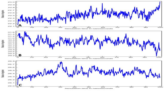 Radius of Gyration (RoG) of all three complexes during the 100 ns run is presented in Figure 6. RoG stability correlates to the protein stability during the simulation run, and its evaluation relies on the center of mass of the protein which characterizes the structure compactness during the simulation. Oleuropein and 3CLpro complex RoG plot represents minimal fluctuations 22.3 to 22.5 Å during the initial 33 ns, after which fluctuations increased up to 22.9 Å until the end of the 100 ns run (Figure 6A). Overall, fluctuation for the entire 100 ns was 0.5 Å for Oleuropein-3CLpro complex. RoG plot for oleuropein and TLR-4 complex showed fluctuations 29.2 to 31.6 Å during the 100 ns run trajectory (Figure 6B). In fact, fluctuations increased for Oleuropein-TLR-4 complex in comparison to Oleuropein-TLR-4 complex, whereas the RoG plot of Oleuropein-POP complex showed minimal fluctuations (26.4 to 26.8 Å) from 30 ns to 100 ns (Figure 6C). However, average fluctuations were within the acceptable range of 0.5 Å, 1.4 Å, and 0.3 Å for Oleuropein-3CLpro, Oleuropein-TLR-4 and Oleuropein-POP complex, respectively.