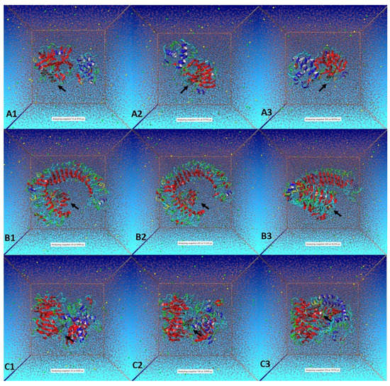 Snapshots of simulation runs for (A) Oleuropein-3CLpro complex, (B) Oleuropein-TLR4 complex, and (C) Oleuropein-POP complex. Here, black arrow indicates the location of Oleuropein.