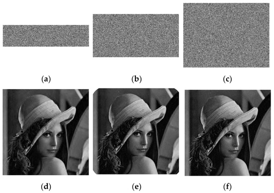 The encryption and decryption results of “Lena” with different CRs. (a) CR = 0.25; (b) CR = 0.5; (c) CR = 0.75; (d) PSNR = 33.3376 db; (e) PSNR = 33.9387 db; (f) PSNR = 32.6499 db.
