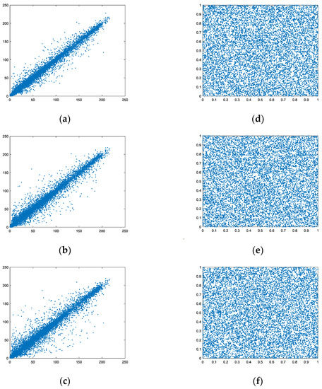 Figure 3 displays the original images, compressed encrypted images, and decrypted images for all of the test images. All experiments were verified with a compression ratio of 0.5 as an example. Hereon, the original images in lines (a)–(f) are 512 × 512 and the original images in lines (g)–(i) are size of 256 × 256.