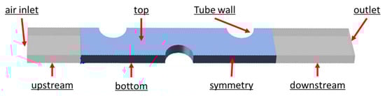 Figure 2 is an illustration of the simulated 3D computational domain. In order to ensure the uniform distribution of inlet fluid flow and avoid the outlet flow recirculation, the downstream and upstream of the computational domain were extended along the flow direction [,].