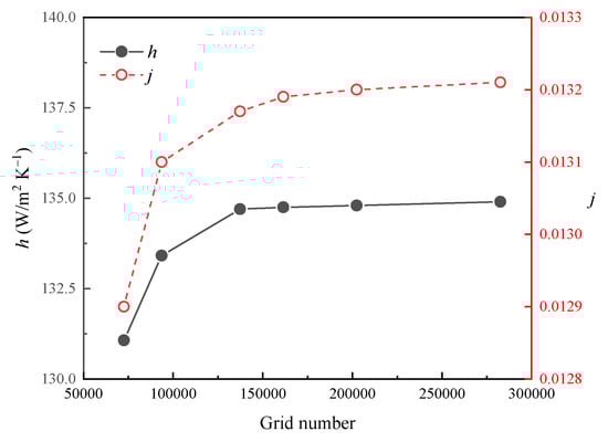 In this study, FLUENT 19.2 is employed to solve the governing equations based on the finite volume approach with structured meshing. The turbulent model standard k-ε of is employed in this simulation. A simple algorithm is applied to the iteration procedure. The second-order discretization scheme is employed for a high accuracy outcome. The numerical convergence criterion is accepted only when the residuals of velocities, pressure, temperature are smaller than 10−6 and 10−4 for continuity.The meshing model independence was verified, the grid number ranges from 72,566 to 282,594, and the calculation was conducted at the inlet air velocity of 3 m/s, and the data are shown in Figure 4. With the increasing quantity of grids, the Colburn j-factor and friction factor f rise rapidly at first and become stable. The number of structured grid increase from 161,538 to 282,594, and the difference in averaged calculation results is below 0.2%. Thus, the mesh with 161,538 cells was finally adopted to the simulations.