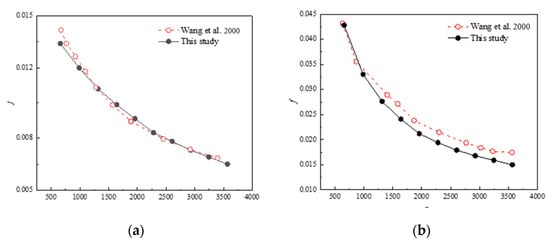 Comparison between calculated and experimental datas of Wang et al. []. (a) Colburn j-factor; (b) Friction factor f.