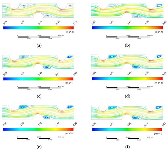 Velocity fields on the middle xy-plane with different pressure conditions. (a) 1 kPa (Re = 56); (b) 5 kPa (Re = 280); (c) 15 kPa (Re = 846); (d) 25 kPa (Re = 1413); (e) 45 kPa (Re = 2546); (f) 101 kPa (Re = 5600).