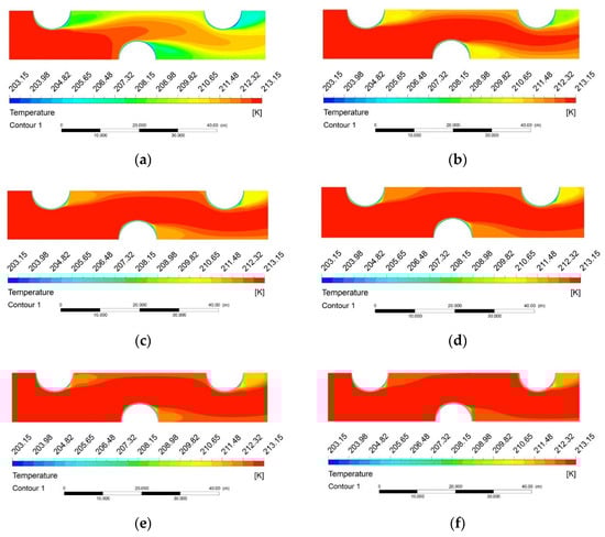 Temperature distribution on the middle xy-plane with different pressure conditions. (a) 1 kPa (Re = 56); (b) 5 kPa (Re = 280); (c) 15 kPa (Re = 846); (d) 25 kPa (Re = 1413); (e) 45 kPa (Re = 2546); (f) 101 kPa (Re = 5600).
