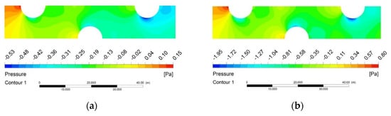 The layered distribution of temperature field at environment pressures ranging from 1~101 kPa are shown in Figure 7. At the inlet airflow velocity of 3 m/s, the mainstream temperature at the same position in the flow field gradually increases with increasing pressure. The change is due to the enhancement of the thermal boundary layer under negative pressure. Temperature gradients are distributed in the boundary layer and the variation in the boundary layer at low pressure show a strong influence on the thermal and flow behavior []. Due to the impact of lower environment pressure on the physical properties of air, heat transfer is more intense when the air flows across the fin. As show in Figure 7a,b, when the environment pressure is higher, the temperature of the main flow region is much higher than that of the wake region. This is mainly attributed to that at higher Reynolds number, boundary layer separation occurs when it flows through the tube walls. It can be noted that, within wake region airflow the temperature is the lowest, and the temperature difference between the tubes and airflow is significantly low, which leads to a poor heat transfer performance in this region. It is also shown in Figure 7, the temperature gradient around tubes is higher at p = 101 kPa compared with that of p = 25 kPa, indicating a higher heat flux generated over the tubes and air, which leads to better heat transfer performance.
