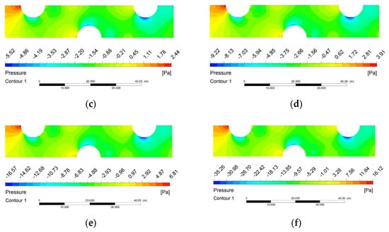 Air–side pressure field at different pressure conditions. (a) 1 kPa; (b) 5 kPa; (c) 15 kPa; (d) 25 kPa; (e) 45 kPa; (f) 101 kPa.