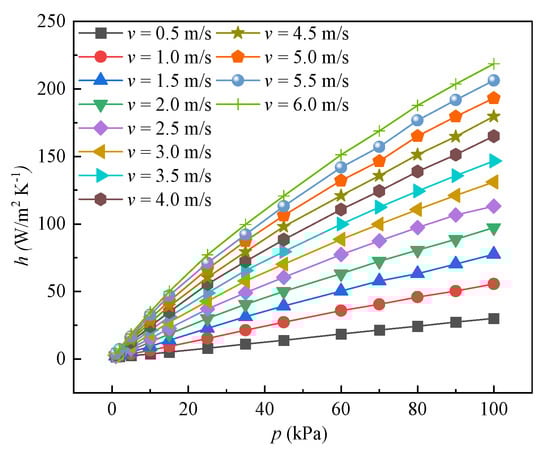 Figure 9 shows the effect of air pressure on the heat transfer coefficient h under different airflow velocities. As shown in the figure, the heat transfer coefficient decreases as the environment pressure decreases at the airflow velocity range from 0.5 m/s to 6 m/s. With increasing air pressure, h increases when the inlet air velocity is constant. According to the results of the simulations, h ranges from 8.02 to 77.26 W/m2 K at the air pressure of 25 kPa. In contrast, h ranges from 30.13 to 218.64 W/m2 K at atmospheric pressure of 101 kPa. Furthermore, it can be observed that the higher the airflow inlet velocity, the stronger the increase of h. For the case of inlet air velocity of 3 m/s, as the pressure decreases from 101 kPa to 0 kPa, the convective heat transfer coefficient on the air-side reduced by 32.4%, 67.25%, and 92.8% on average when the air pressure is 60 kPa, 25 kPa, and 5 kPa, respectively. It is indicated that the air-side convective heat transfer of fin-and-tube is dramatically deteriorated due to the thin air under low pressure. The density of air is positively related with the air pressure. Nevertheless, the specific heat capacity is not changed. Thus, the heat transfer capacity reduces when the airflow across the fin with the surrounding pressure decreases.