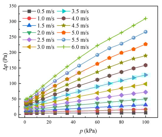 Pressure drop is also an important indicator to assess the characteristics of a heat exchanger. The effect of air pressure on the pressure drop with various inlet airflow velocities is shown in Figure 10. The pressure penalty rises with the increase in the air pressure at the same velocity. When the environment pressure decreases from 101 to 1 kPa, the pressure drop decreases by 77.95% if the velocity is constant at 3.5 m/s. The reason is that the physical properties of airflow are sensitive to air pressure. When the air velocity increases from 3.0 to 6.0 m/s, the pressure drop increases by 202%, 220.5%, and 215.3% at an air pressure of 25 kPa, 60 kPa, and 101 kPa, respectively. It is demonstrated that the pressure drop increases more rapidly at higher velocities with air pressure increasing. It implies that mixed airflow due to larger Re at higher velocity contributes to the increase in pressure drop.