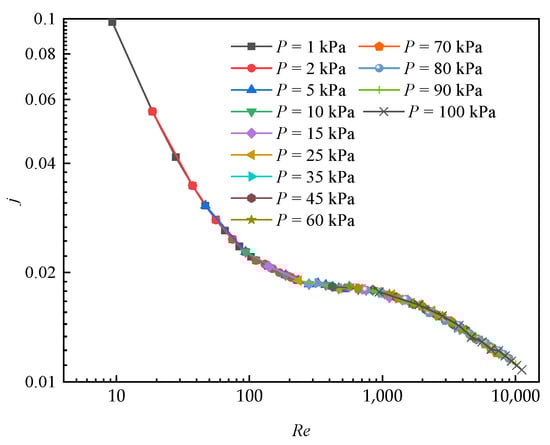 Figure 11 illustrates the air-side j with Re for various environment pressure values. The Colburn factor was calculated by the Equation (5). As can be seen the higher the air pressure and Re numbers, the smaller the heat transfer factor. Despite different pressures, all the data nearly regresses to a certain profile as a function of Re. j under 25 kPa is increased by 28.15% in constrast to that of normal pressure. The main reason is that the heat transfer coefficient reduces at a slower rate than that of the density as the pressure decreases, so the j increases with decreasing pressure. In addition, it can be observed that j decreases dramatically at lower Re, because the thermalphysical properties of air vary more significantly when the environment is lower than 25 kPa. Thus, the heat transfer capacity is extremely small at a much lower pressure environment.