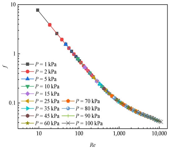 Figure 12 depicates the variations in friction factor against Reynolds number under low pressure environment. It can be seen from the figure that the friction factor increases as Re decreases. In addition, it rises with gauge pressure reducing. f at 25 kPa is increased by 86.4% in comparison with the value at normal pressure, which indicates the pressure drop is lower at smaller air pressure. In addition, in the velocity range of 0.5~6 m/s, it is concluded that the friction factor, despite being under different air pressures, eventually fall on a certain curve that is closely correlated to Re. Additionally, the rapid decrease in f occurs when the when the environment is lower than 25 kPa, which is similar to the trend of j as shown in Figure 11.