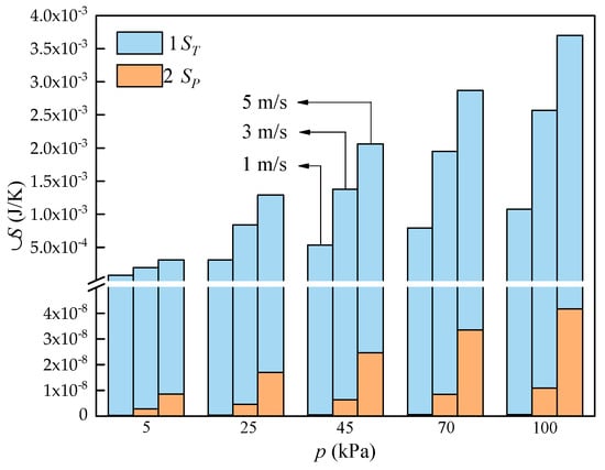 The total entropy generation can be split into entropy generation by temperature difference ΔST and entropy generation by pressure drop ΔSP. ΔST and ΔSP at various environment pressure and air velocity are described in Figure 14. It can be found that both of them keep increasing with the uprising velocity and environment pressure of airflow. When the air pressure reduces from 101~5 kPa, ΔST decreases by 92.52%, 92.44%, and 91.62% and reduction of ΔSP up to 50.58%, 73.86%, and 79.45% at the air velocities of 1, 3 and 5 m/s, separately. It is also attributed to the variation in thermal properties. In addition, keeping air pressure at 101 kPa, the entropy generation increased by 242.59% when the air speed ranges from 1 to 5 m/s, this due to the increment of airflow velocity leading to larger heat transfer temperature difference and flow resistance, resulting in the increase in heat exchange capacity and entropy generation. It can also be found that ΔST is much higher than ΔSP under a certain working condition. For the cases discussed in this work, ΔST accounts for above 99% of the total entropy generation while the entropy generated by pressure drop is really small. For instance, ΔSP accounting for 0.00011%, 0.00055% and 0.0013% at inlet air velocities of 1, 3 and 5 m/s, separately. Hence, it is concluded that during the design of a practical air-and-tube heat exchanger, the temperature difference between air and working fluid should be reduced to further reduce the entropy generation. Furthermore, considering the irreversible losses, air higher inlet air velocities are not recommended during the air-and-tube heat exchangers’ design and operation.
