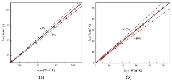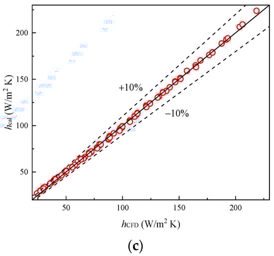 Figure 15 illustrates the comparison of heat transfer coefficient between the simulation results and the newly proposed correlations. It can be noted that the newly developed model can predict all of the data within the ±5%, ±10%, and ±15% error range, respectively. Moreover, Equations (12)–(14) for the different pressure ranges give the mean deviation of 2.73%, 2.56%, and 1.66%, respectively.