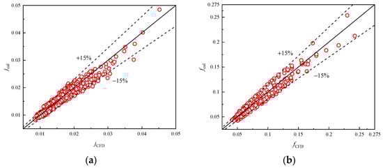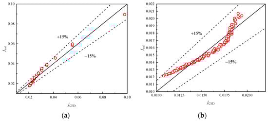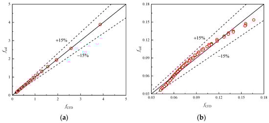 Correlation calculation error of friction factor f. (a) Re < 500; (b) (500 ≤ Re < 11,136).
