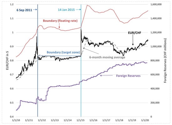 - Hui, C.H.; Lo, C.F.; Fong, T. Swiss franc’s one-sided target zone during 2011–2015. Int. Rev. Econ. Financ. 2016, 44, 54–67. [Google Scholar] [CrossRef]