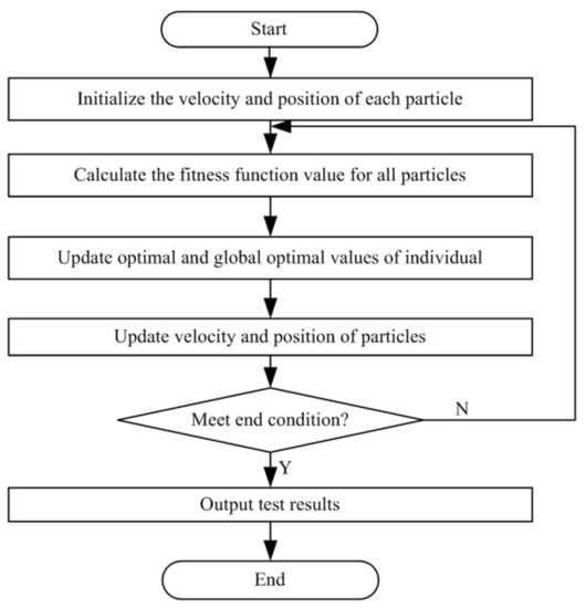 where is the velocity of the particle at the iteration, is the position of particle at the iteration, and the position of the particle is related to its velocity. is an inertia weight factor, which is used to reflect the motion habits of particles and represent the tendency of particles to maintain their previous speed. is a self-cognition factor, which reflects the particle’s memory of its own historical experience, and represents that the particle has a tendency to approach its best position. is a social cognition factor, which reflects the population’s historical experience of collaboration and knowledge sharing among particles, and represents that particles tend to approach the best position in the population or field history. and represent random numbers in [0, 1], which denote the remembrance ability for the research. Generally, the value in the can be clamped to the range [−, ] in order to control the excessive roaming of particles outside the search space. The PSO is terminated until the maximal number of iterations is reached or the best particle position cannot be further improved. The PSO achieves better robustness and effectiveness in solving optimization problems.