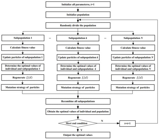 Step 4: After T0 iterations are executed, to enhance population diversity, the particles are randomly exchanged between populations every interval R iteration to recombine subpopulations. The recombination of subpopulations is described as follows: All subpopulations randomly select 50% of the particles, which are randomly exchanged with the particles of other populations. Then, according to the fitness values of all particles in all subpopulations, 1/N particles with the best fitness values in each subpopulation are selected to construct a new population. It is worth noting that the exchanged particle can be any particle in any other population.