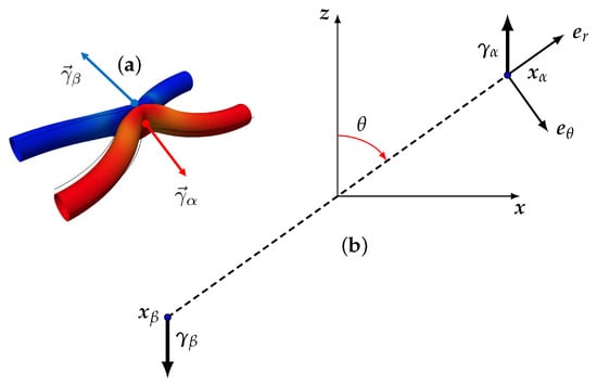 Previous experimental [30,31] and numerical investigations [32] about the location of the structures with extreme local energy transfer showed that they are located near interactions (possibly reconnection) of Burgers vortices. Previous and recent high-resolution numerical simulations of reconnection of anti-parallel vorticity filaments [33,34] showed that the process is associated with the formation of a local cusp over each filament that could possibly lead to a singular behaviour [35]. This possibility was confirmed by a detailed study of the interaction of two Burgers vortices conducted by [36,37,38,39,40] using the Biot–Savart approximation. They showed that the interaction indeed leads to a cusp formation on the vortex line, with very large, possibly diverging velocities at the tip of the cusp, with orientation along the bisector of the angle of the cusp. The reconnection was also found to be associated with a depletion of the helicity that eventually reaches zero at the reconnection [36]. In this picture, the associated pinçons created by a coarse-graining at the Kolmogorov scale would then be located at the tip of each cusp, with spins in the direction of the bisector of the cusps (see Figure 3a). This shows the interest of studying more closely the dynamics of a pair of pinçons and see how it compares with known features of the reconnection. This is the aim of the present section. In all the sequel, we renormalize the length by , the distance between the two pinçons at time and the time by the associated viscous time . We first start with the simplest case, where the pair constitutes a dipole.