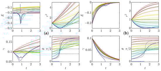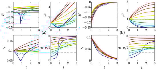 Dynamics of a dipole of pinçon for various initial conditions and (a) without friction, corresponding to the initial stage of the dynamics, just after pinçons creation; (b) with friction coefficient 0.7, corresponding to the late stage dynamics. The radius is initially fixed to , the dipole intensity is initially set to and the initial dipole orientation is fixed at different values between 0 and (identified by different colors). The panel represents the time evolution of the different quantities: E: Interaction energy; : Square of Dipole separation; : Dipole intensity; : Dipole orientation. Black dashed lines on figure correspond to , and .