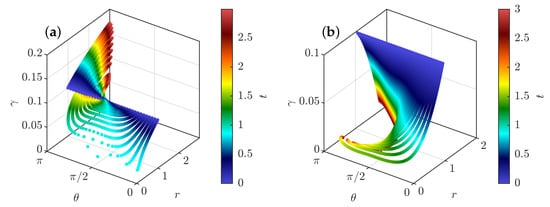 Phase space for a dipole of pinçons color-coded by the time, shown on the color bar. (a) Without friction, corresponding to the initial stage of the dynamics, just after pinçons creation; (b) With friction—coefficient 0.7—corresponding to the late stage dynamics. The radius is initially fixed to , the dipole intensity is initially set to and the initial dipole orientation is fixed at different values between 0 and .