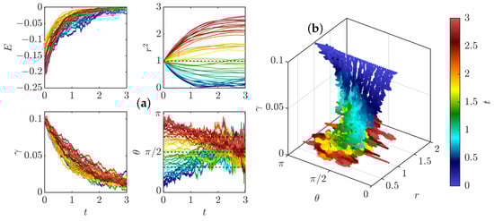 Integrating (40) allows for efficiently studying the dynamics of a noisy dipole, provided two criteria are satisfied: (i) , in order to be in the weak limit and (ii) r is large enough () so that the two pinçons may still be considered as distinct. Moreover, for numerical reasons, we stop the integration whenever or , in which case we consider that the pinçons are either dying or that the dipole has escaped to infinity. In practice, most of our simulations were stopped because either or . Figure 7 shows the evolution of a dipole satisfying the equations of motion (40) for fixed initial radius and , various initial values of and and . Several tendencies emerge, as illustrated in Figure 7. First, the integration time is slightly longer as the noise may remain stationary for a certain amount of time. Second, the evolution of is not monotonic anymore and the angle tends to get closer to the values cancelling , and tend to in most of the cases. As a result, the dipole can be maintained for some time in a non-equilibrium balance, where dissipation exactly balances the stochastic forcing, allowing the dipole intensity to decay less rapidly, and the dipole to live longer. We have checked that, when the noise is too large, then fluctuations are enough to bring the dipole intensity close to the limit or in a finite time, resulting in the dipole collapse or death quicker than in the zero temperature limit.