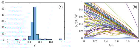 During the collapse stage, the radius evolution is fitted with a power law in order to compare the exponent with the Leray scaling [19]. Figure 10a shows the histogram of the values of the exponent obtained by fitting the law for the collapse cases. We observe that most of the values are near which correspond to the Leray exponent. Figure 10b shows the time dynamics of rescaled squared radius. The Leray scaling is found to be verified asymptotically as .