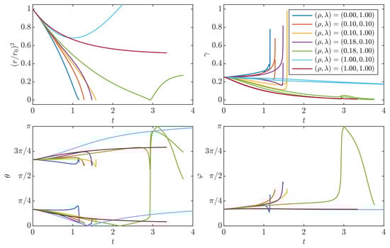 Interestingly, the different cases partition in different areas the phase space r, and , with , as illustrated in Figure 9b. One sees that the collapse mode tends to occur around meaning that at least one of the two pinçons tend to orientate at , or from the separation vector. In contrast, the two expansion modes proceed with , corresponding to situations where the pinçons are aligned or anti-aligned with their separation vector. Summarizing, two new cases are found with respect to the dipole dynamics, namely a new mode of expansion, made with two aligned pinçons following each other, and a new mode of collapse following the law , with one component reaching the asymptotic value , and corresponding to a generic reconnection event. In the sequel, we study in more details these events.