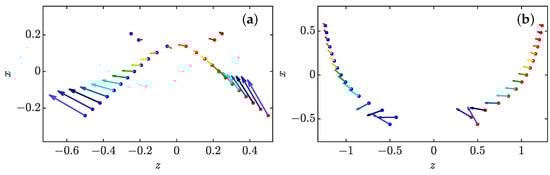 Dynamics of a pair of pinçons as a function of time in the plane defined by and for two different forcing characteristic time coefficient () and dissipation coefficient : (a) and (b) . The vectors gives the projection of and in the plane and the color codes the time, from (dark blue) to (dark red), as well as the coordinate of the points on the vertical axis x. In both cases, the two pinçons (blue and red points) move initially towards each other (the distance is read on the horizonal axis z) and then their orientations change and they repel each other. In the case of (a), the transition between the two phases has a configuration similar to the dipole with one of the pinçons axis abruptly turning from an angle close to 0 to an angle close to , then the pinçons die very fast. In the case of (b), the dynamics are smoother with hardly any change in the dipole relative orientation, only the axis angles change slowly, and the pinçons survive a long time with a stable configuration.
