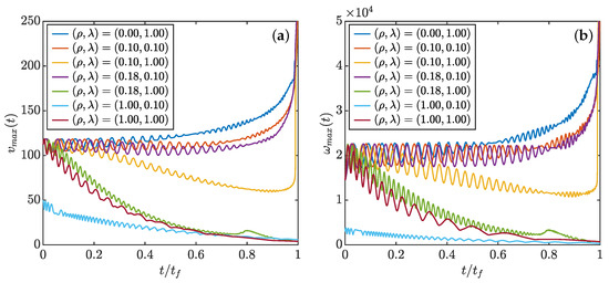 Time evolution of the maximum of rescaled velocity field (a) and vorticity field (b) around a pair of pinçons with same initial configurations and different forcing characteristic time coefficient and dissipation coefficient . The rescaling is the same as in Figure 1, with the initial separation between the pinçons. The values correspond to a moving average over 15 time steps.
