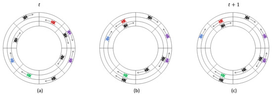 One step of the locust model with , split into horizontal and vertical movements: (a) shows the initial configuration at the beginning of the current time step t; (b) illustrates changes to the configuration after conflicts and horizontal movements; and (c) is the configuration at the beginning of time (or equivalently the end of time t) after vertical movements. The front and back of the blue locust are the red and green locusts, respectively. The purple locusts conflict with each other. Since conditions (1)–(3) are fulfilled, the blue locust may switch tracks, and it does so in the illustration.