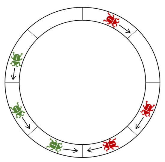 In this work, we study the dynamics of “locust-like” agents moving on a discrete ringlike surface. The model we study is inspired by the following well-documented experiment [12]. Place many locusts on a ringlike arena at random positions and orientations. They start to move around and bump into the arena’s walls and into each other, and as they do, remarkably, over time, they begin to collectively march in the same direction–either clockwise or counterclockwise (see Figure 1). Inspired by observing these experiments, we asked the following question: What are simple and reasonable myopic rules of behavior that might lead to this phenomenon? Our goal is to study this question from an algorithmic perspective by considering a swarm of autonomous and identical discretized mobile agents that act according to a local algorithm. The precise mechanisms underlying locusts’ behaviors are very complex and subject to intense ongoing research, e.g., [3,12,13,14,15]. Consequently, as with much of the literature on swarm dynamics [7,16,17], our goal is not to study an exact mathematical model of locusts in particular, but to study the kinds of algorithmic local interactions that lead to collective marching and related phenomena. The resulting model is idealized and simple to describe, but the patterns of motion that emerge while the locusts progress toward a “stabilized” state of collective marching are surprisingly complex.